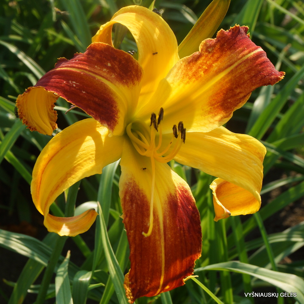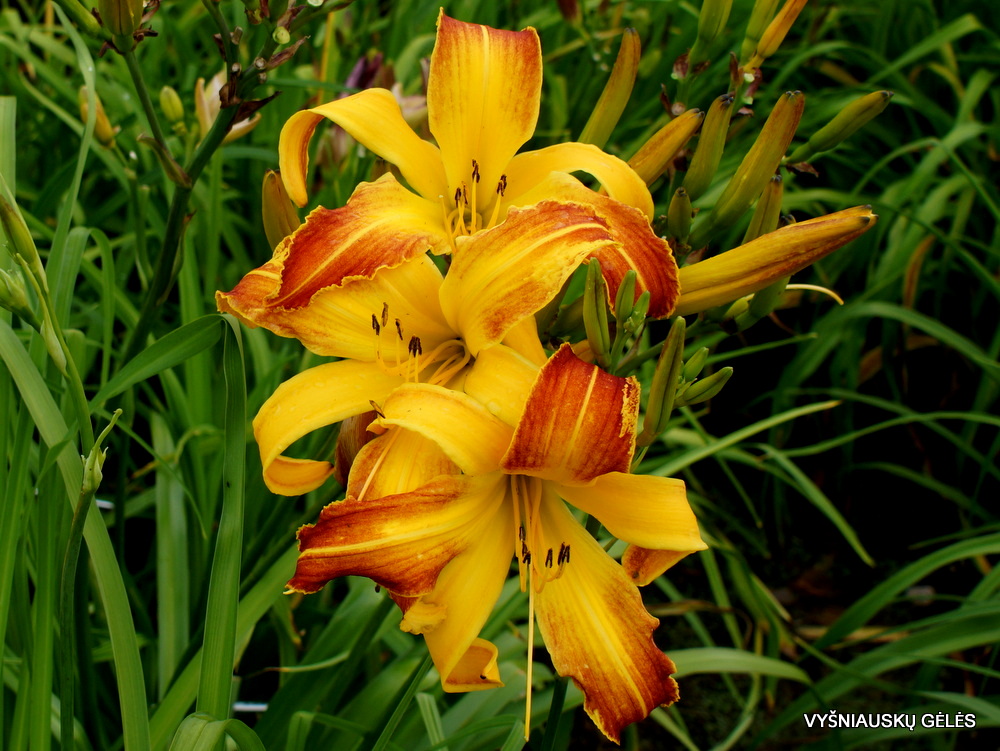 Žiedai vidutinio dydžio (15 cm skersmens) persiliejančių rusvų, rausvų ir geltonų atspalvių. A – 65 cm