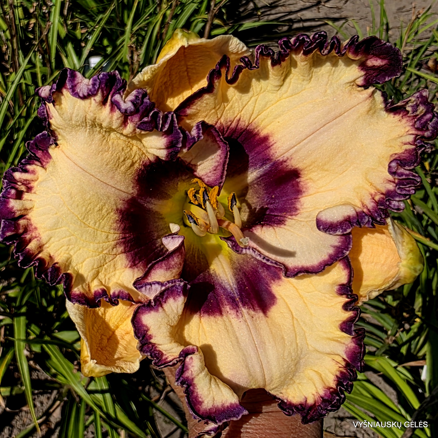 Žiedai vidutinio dydžio (14 cm skersmens) kreminiai su purpurine akimi ir apvadu. A – 100 cm