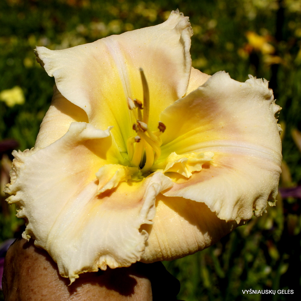 Žiedai vidutinio dydžio (14 cm skersmens) kreminiai su rožiniu atspalviu ir rožine akimi. Skulptūrinė. A – 95 cm
