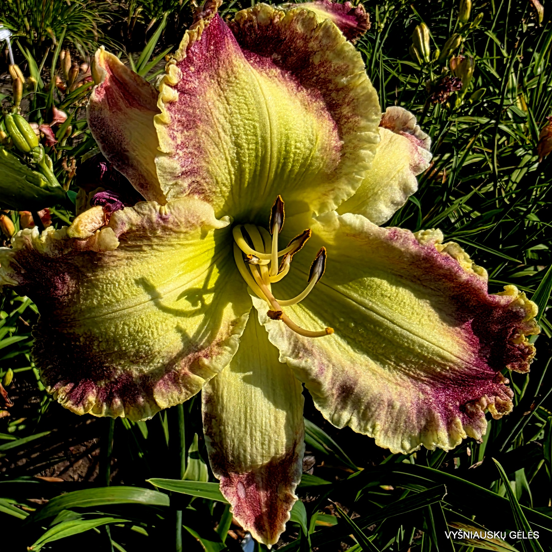 Žiedai dideli (22 cm skersmens) purpuriškai rožiniai su labai dideliu žalsvu centru ir apvadu. A – 70 cm
