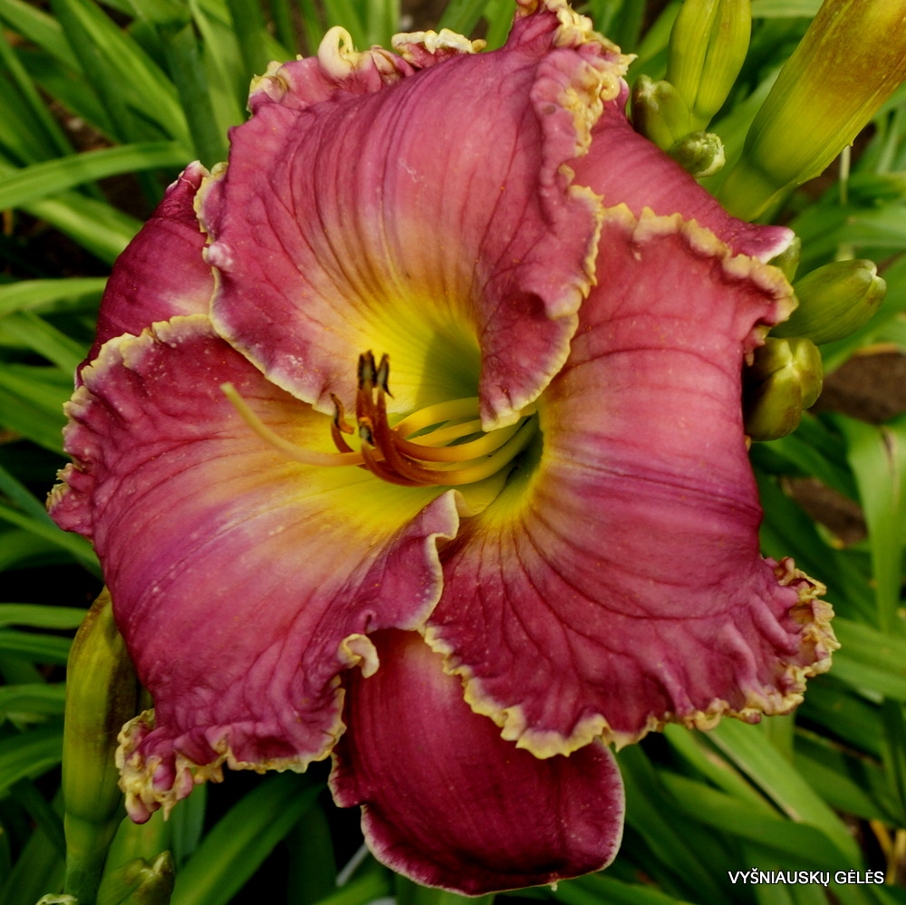 Žiedai vidutinio dydžio (14 cm skersmens) alyviškai rožiniai su geltonu apvadu. A – 75 cm