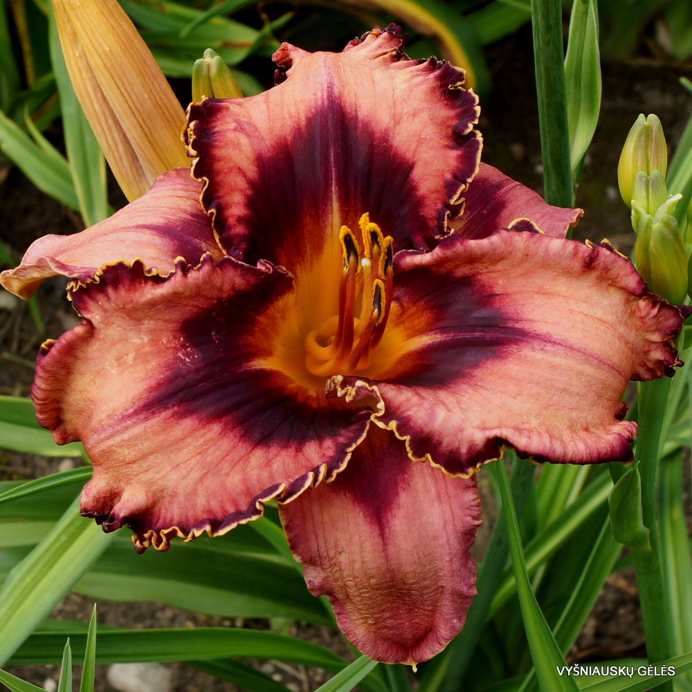Žiedai nemaži (17 cm skersmens) rožiniai su beveik juodu centru ir apvadu. A – 90 cm