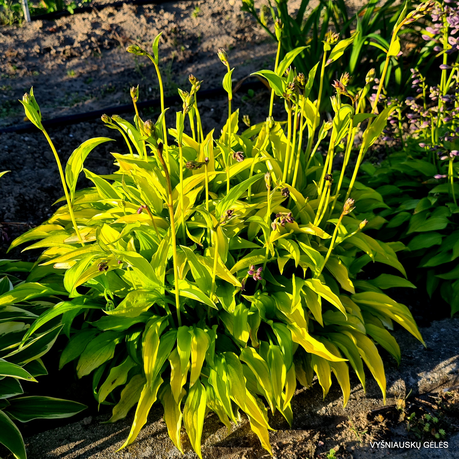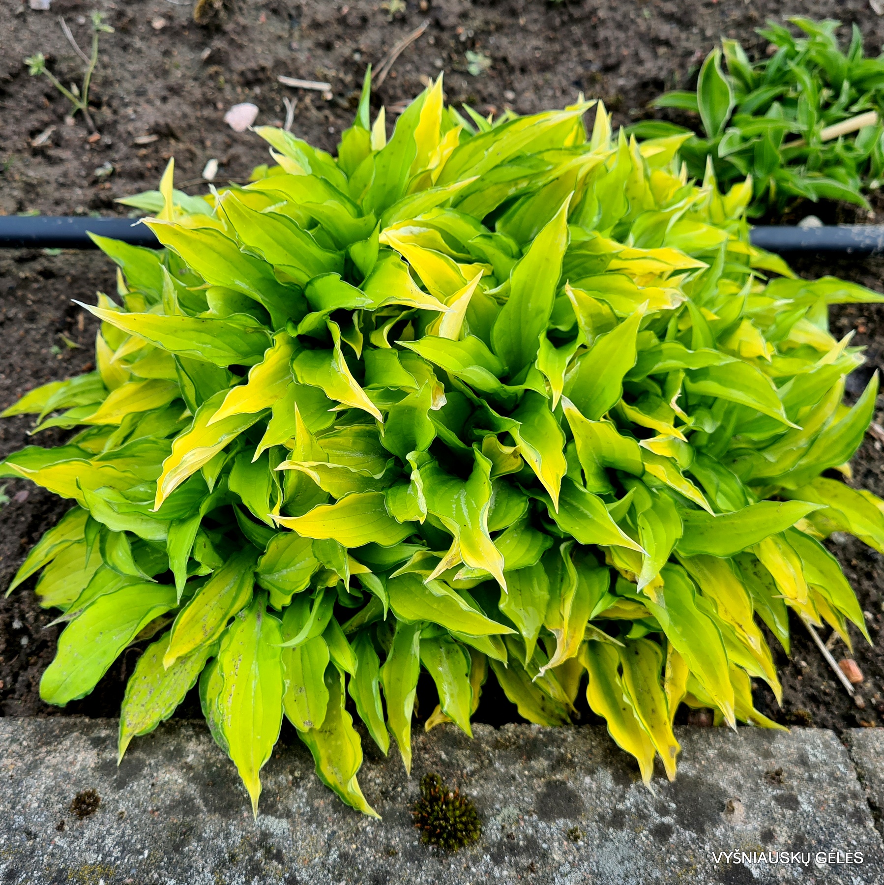 Lapeliai geltoni su žaliu banguotu pakraščiu. Labai gausiai žydinti. Gali augti saulėje, tuomet būna geltonesnė. Pavėsyje būna gelsvai salotinė. Nedidelė. A – 15 – 20 cm