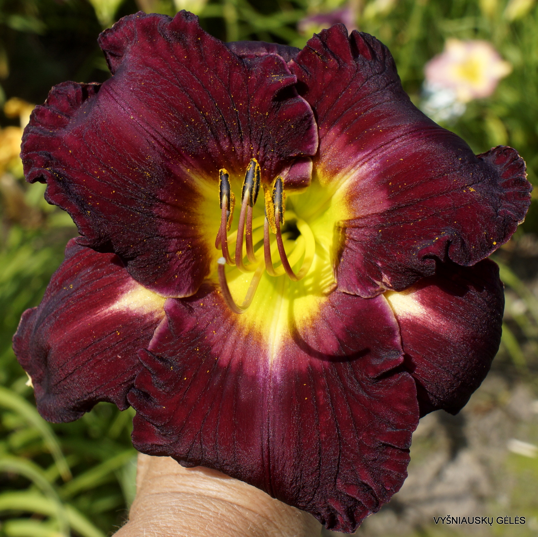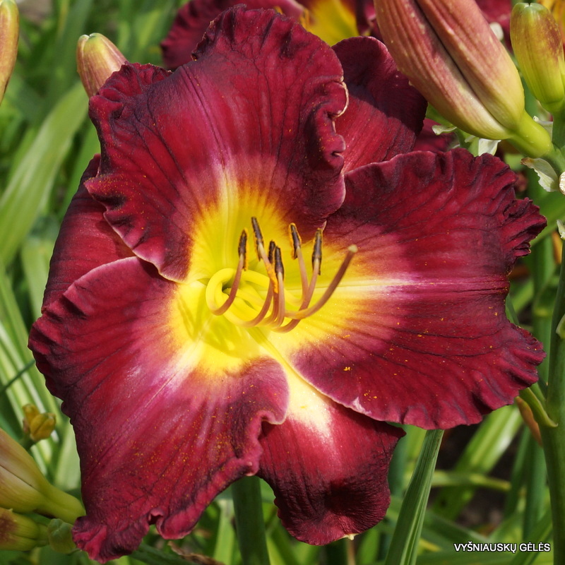 Žiedai vidutinio dydžio (12,5 cm skersmens), ryškiai raudonai purpuriniai su levandiškai purpuriniu vandenženkliu ir žaliu centru. A – 70 cm