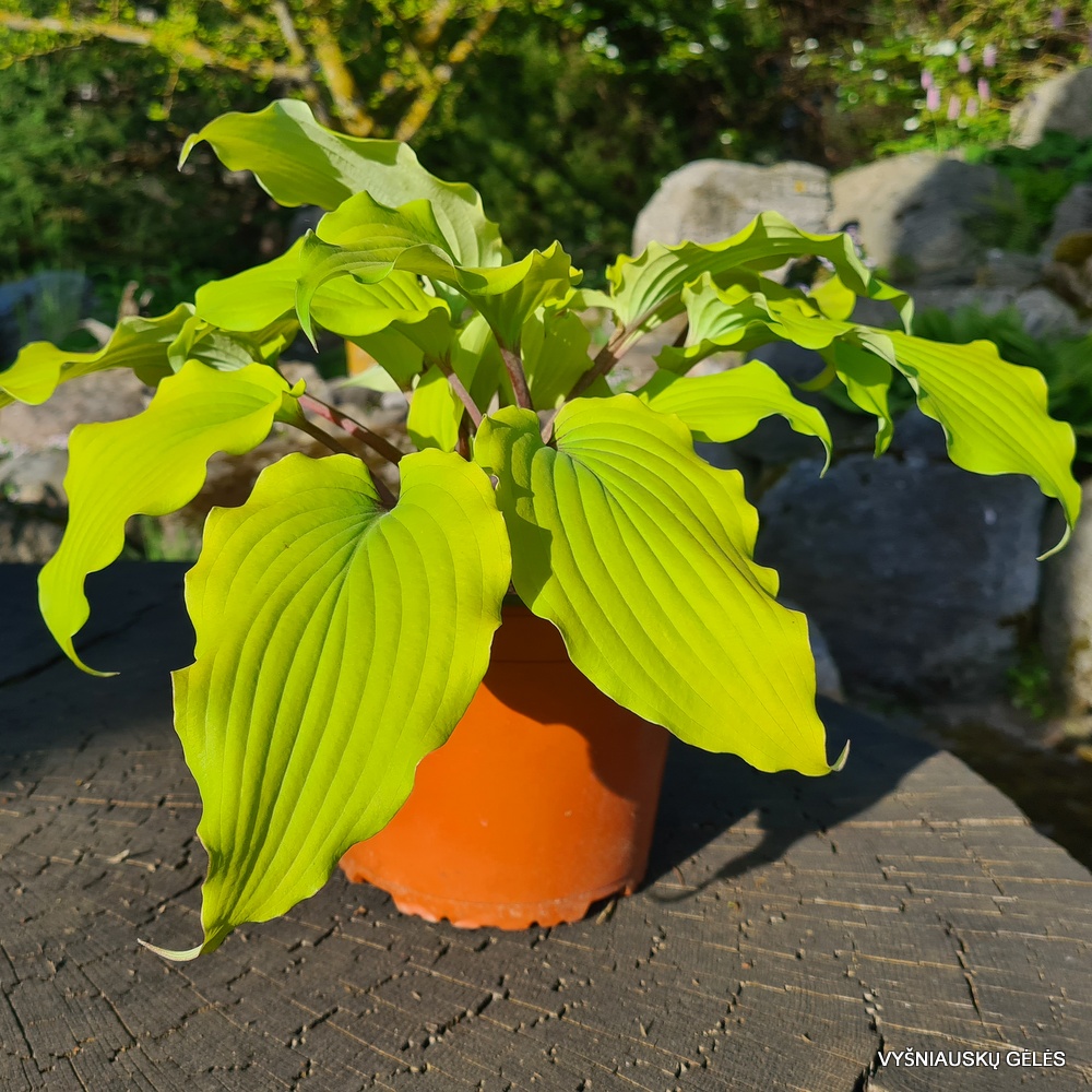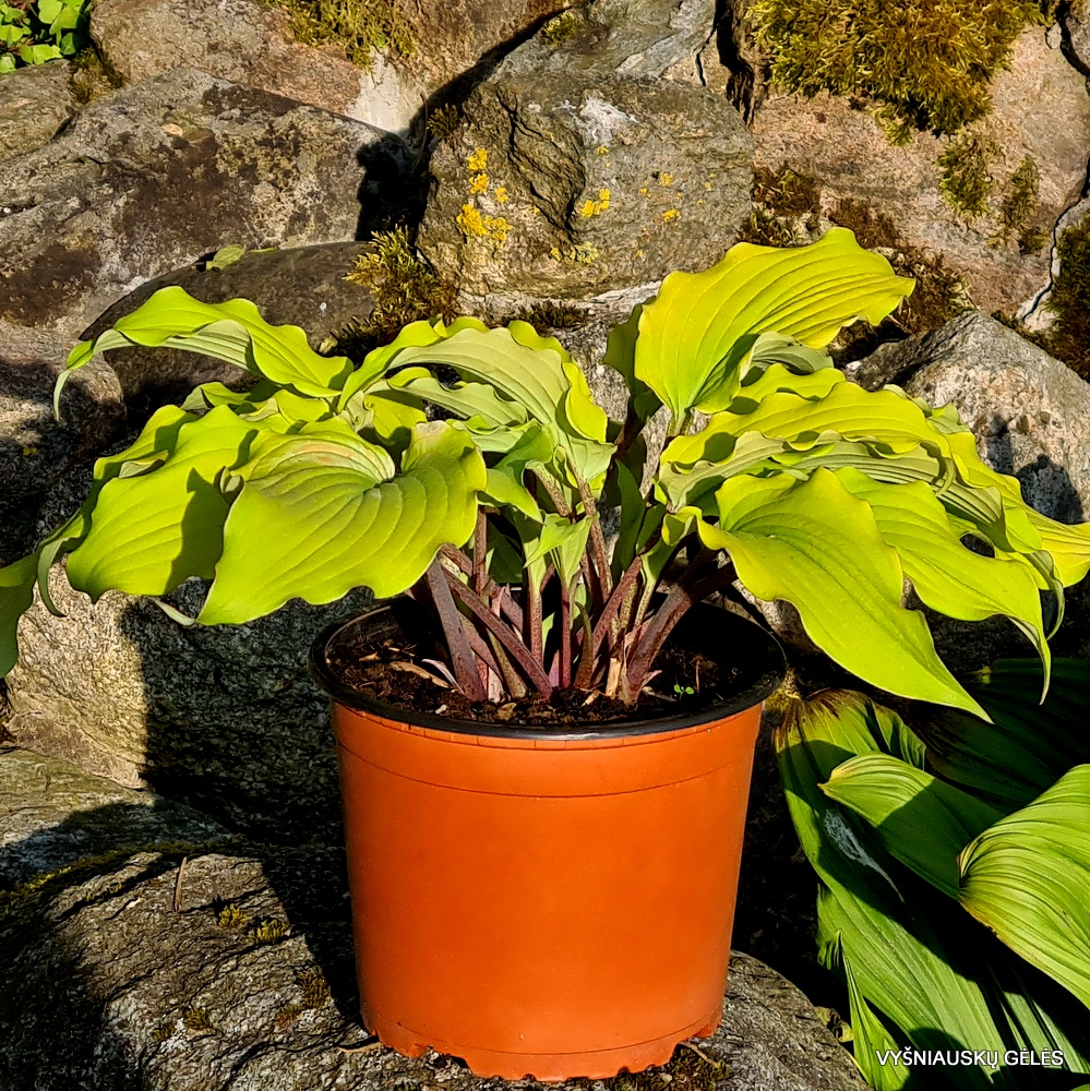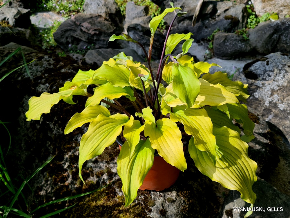 Labai banguoti ryškiai geltoni lapai, kurie vėliau sezono metu tampa žalesni. Lapkočiai ir žiedynstiebiai ryškiai raudonai violetiniai. Reta. Aukštis – 30 cm