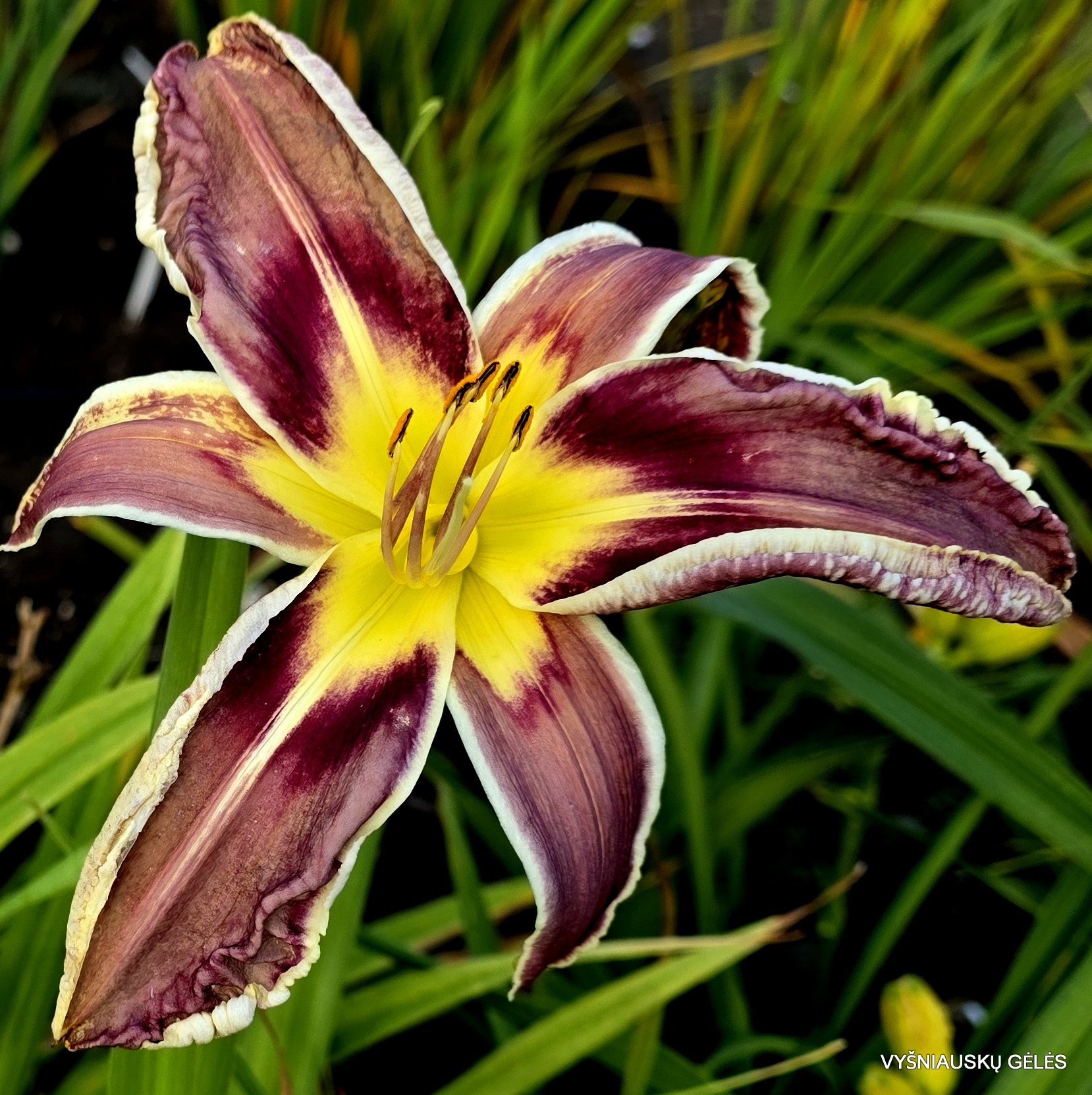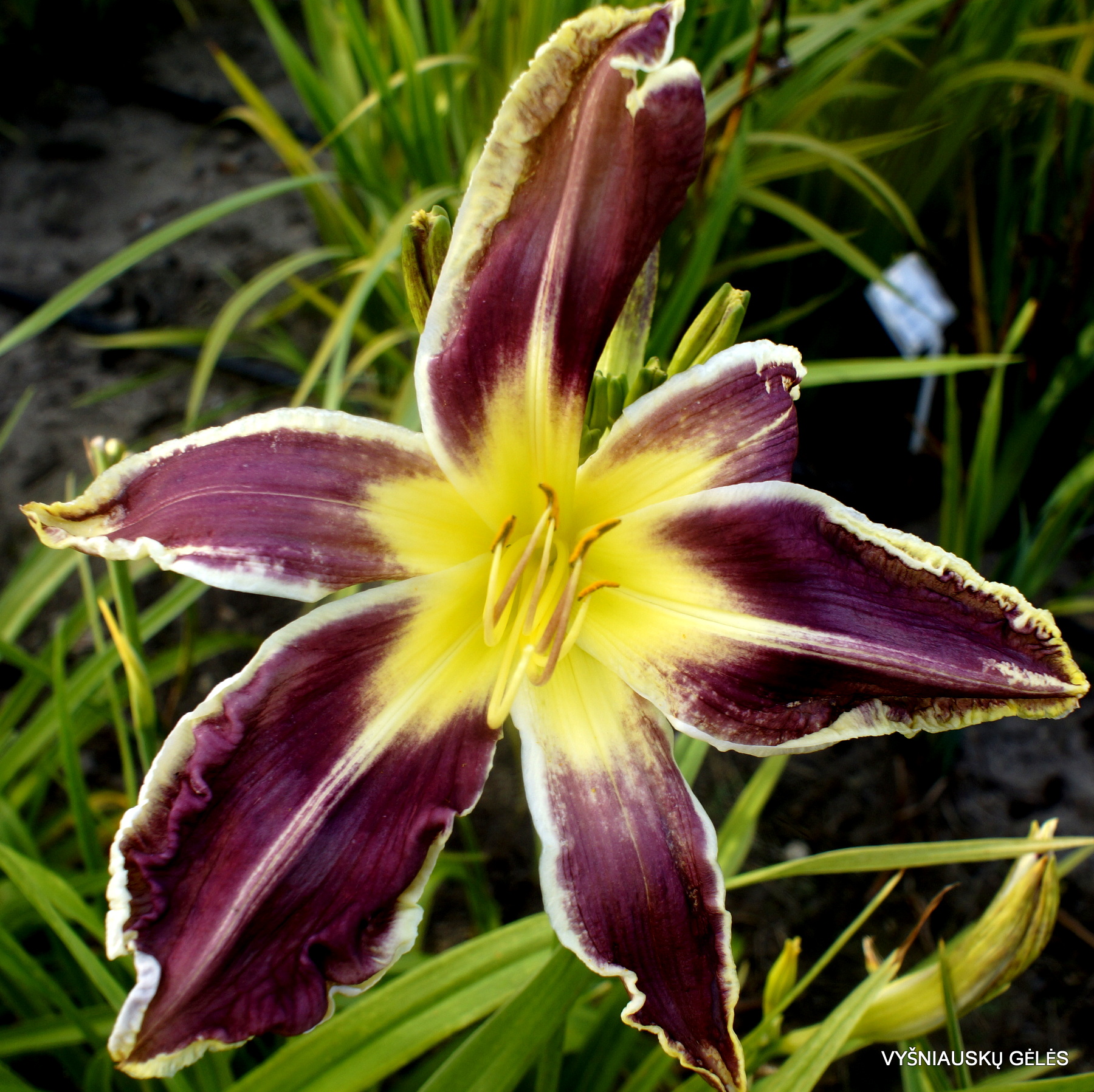 Žiedai dideli (19 cm skersmens) purpuriniai su kreminiu apvadu. A – 75 cm