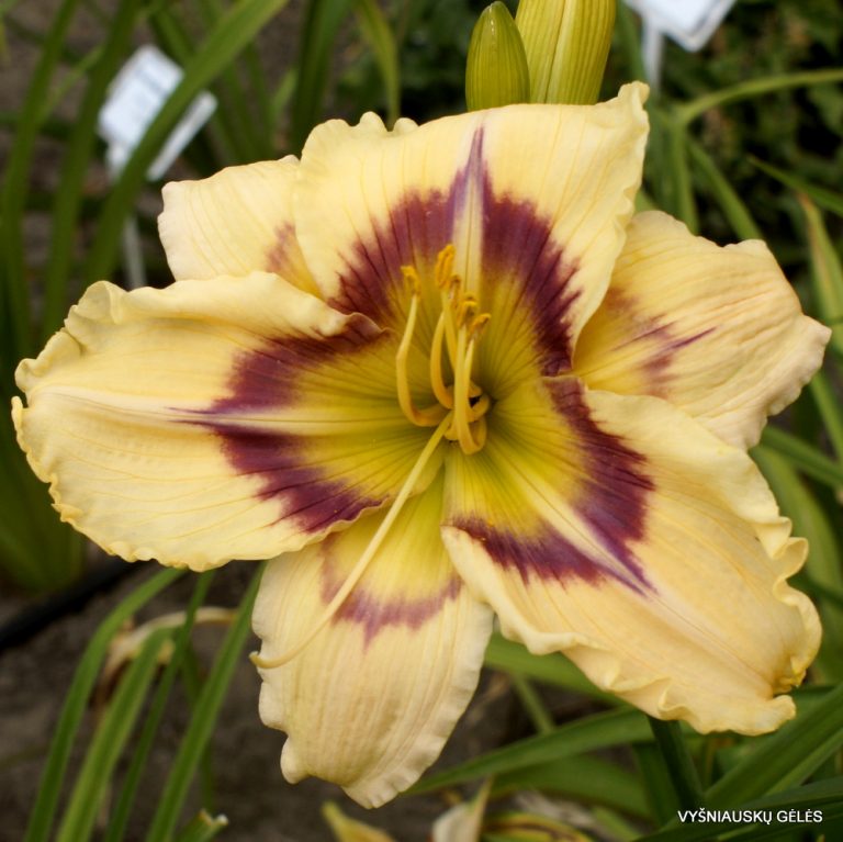 Žžiedai nemaži (17 cm skersmens) kremiškai geltoni su violetiškai purpurine dėme. A – 65 cm