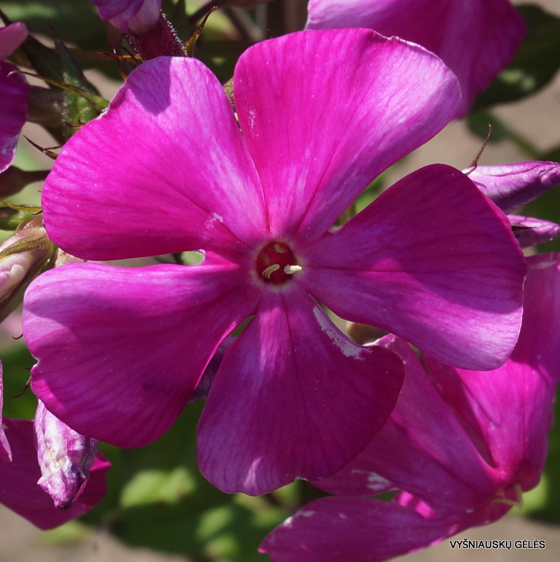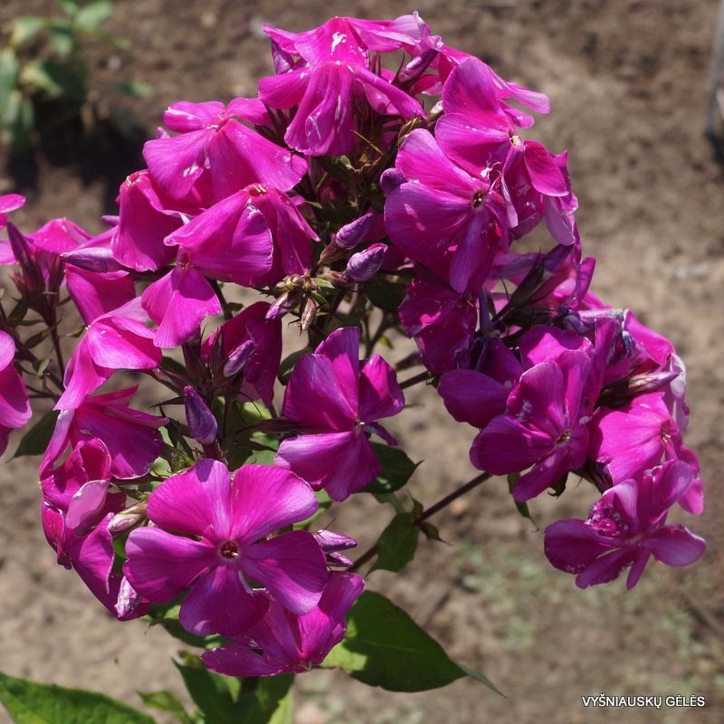 Žiedai stambūs, raudonai purpuriniai su šviesesnėmis juostelėmis ir banguotais vainiklapiais. A – 70-75 cm