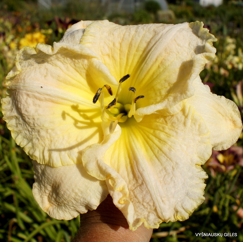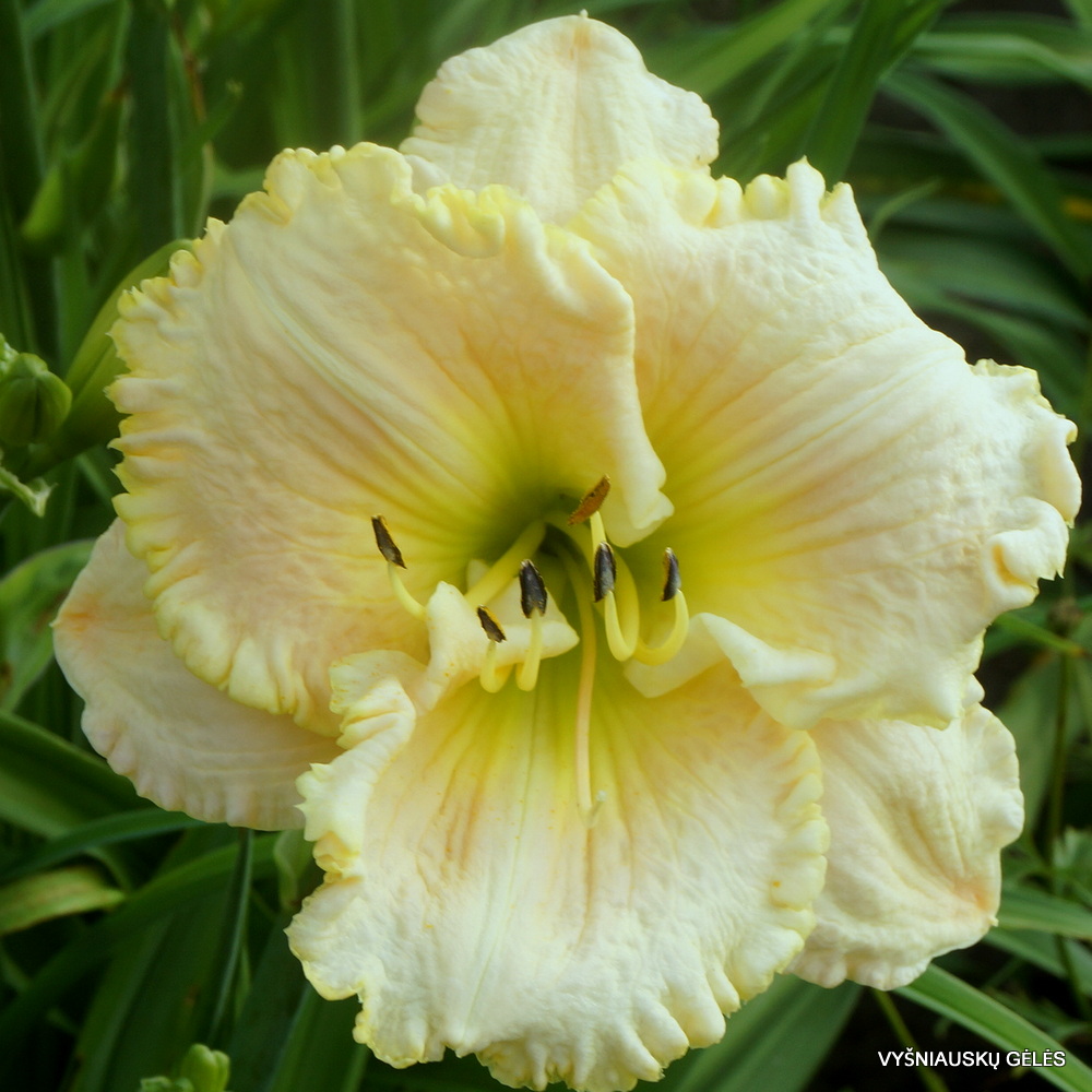 Žiedai nemaži (18 cm skersmens) kremiškai balti su žaliu centru. A – 65 cm