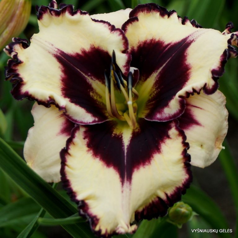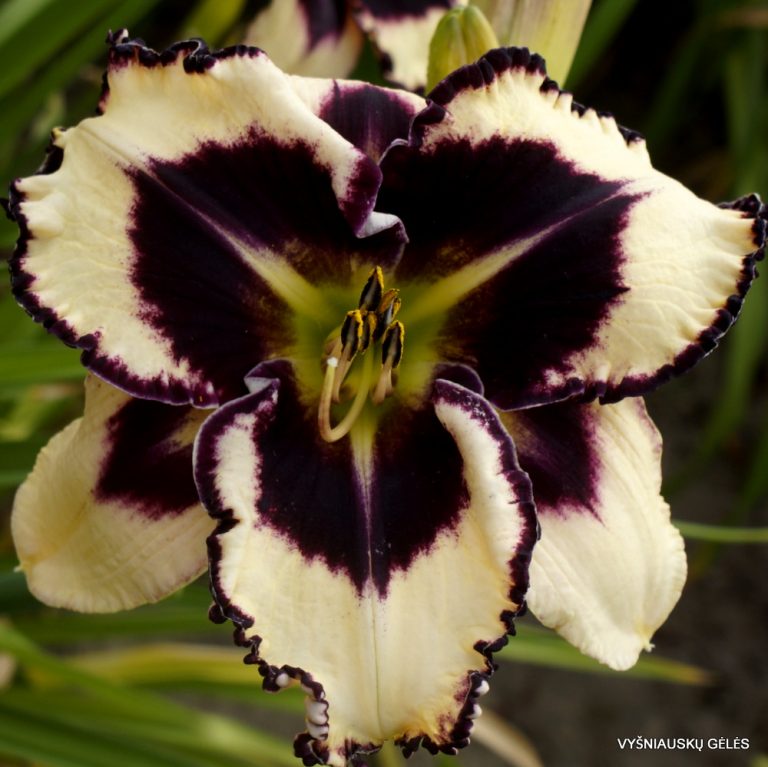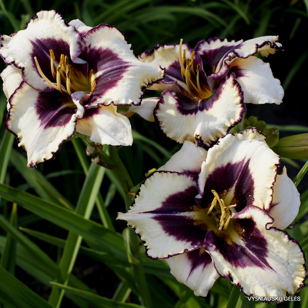 Žiedai nemaži (17 cm skersmens) beveik balti su juodai purpurine dėme ir apvadu. A – 75 cm