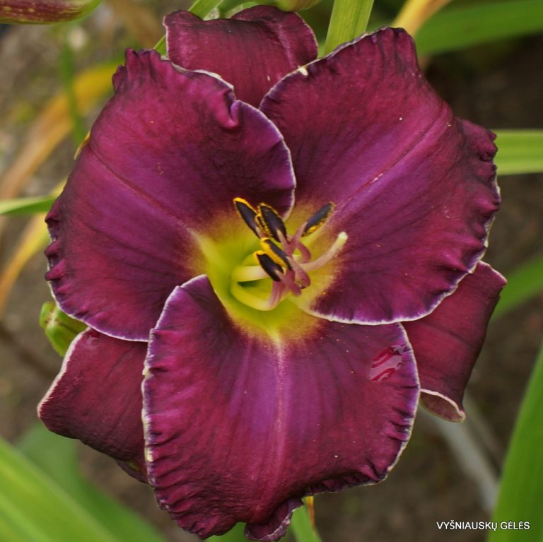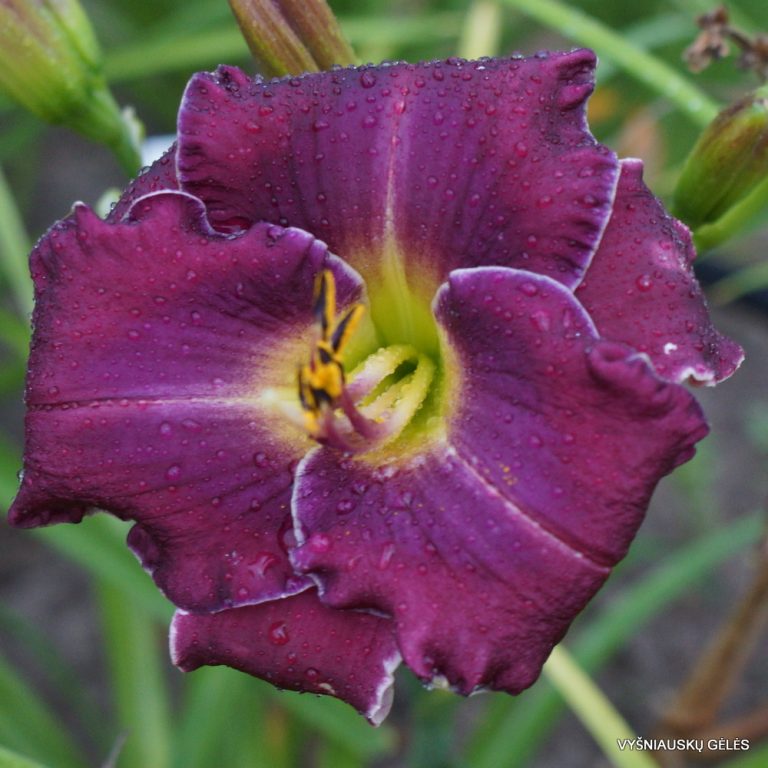 Žiedai vidutinio dydžio purpuriškai violetiniai su mėlyna dėme ir dviejų spalvų apvadais. A – 50 cm