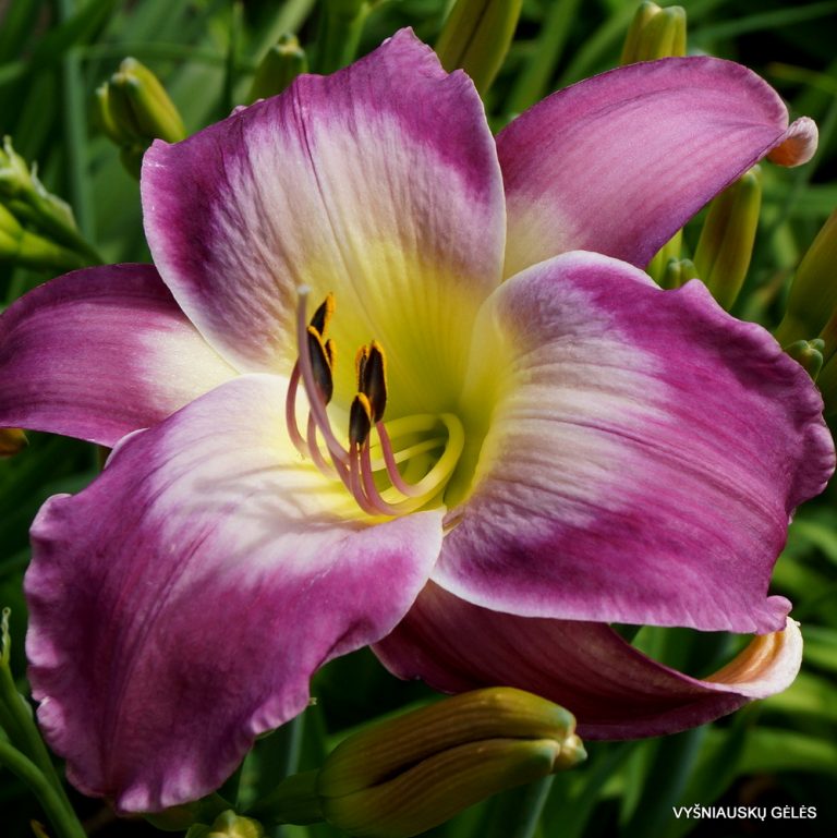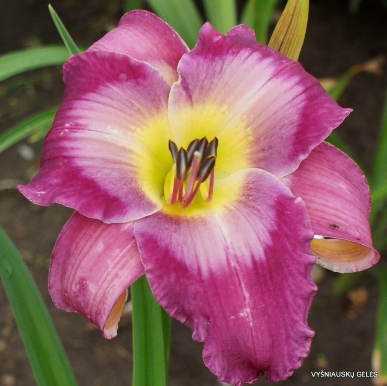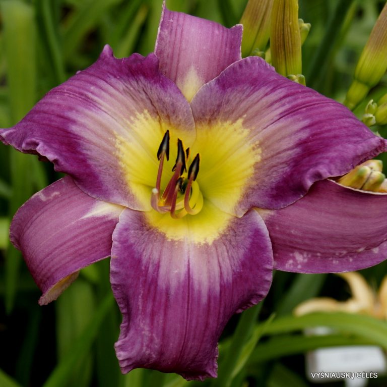 Žiedai vidutinio dydžio (15 cm skersmens) levandiškai purpuriniai su šviesia dėme. A – 85 cm