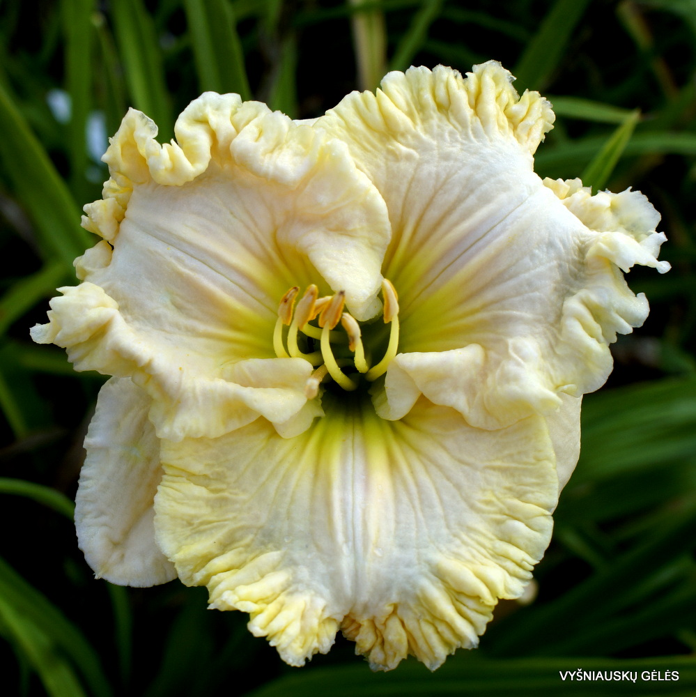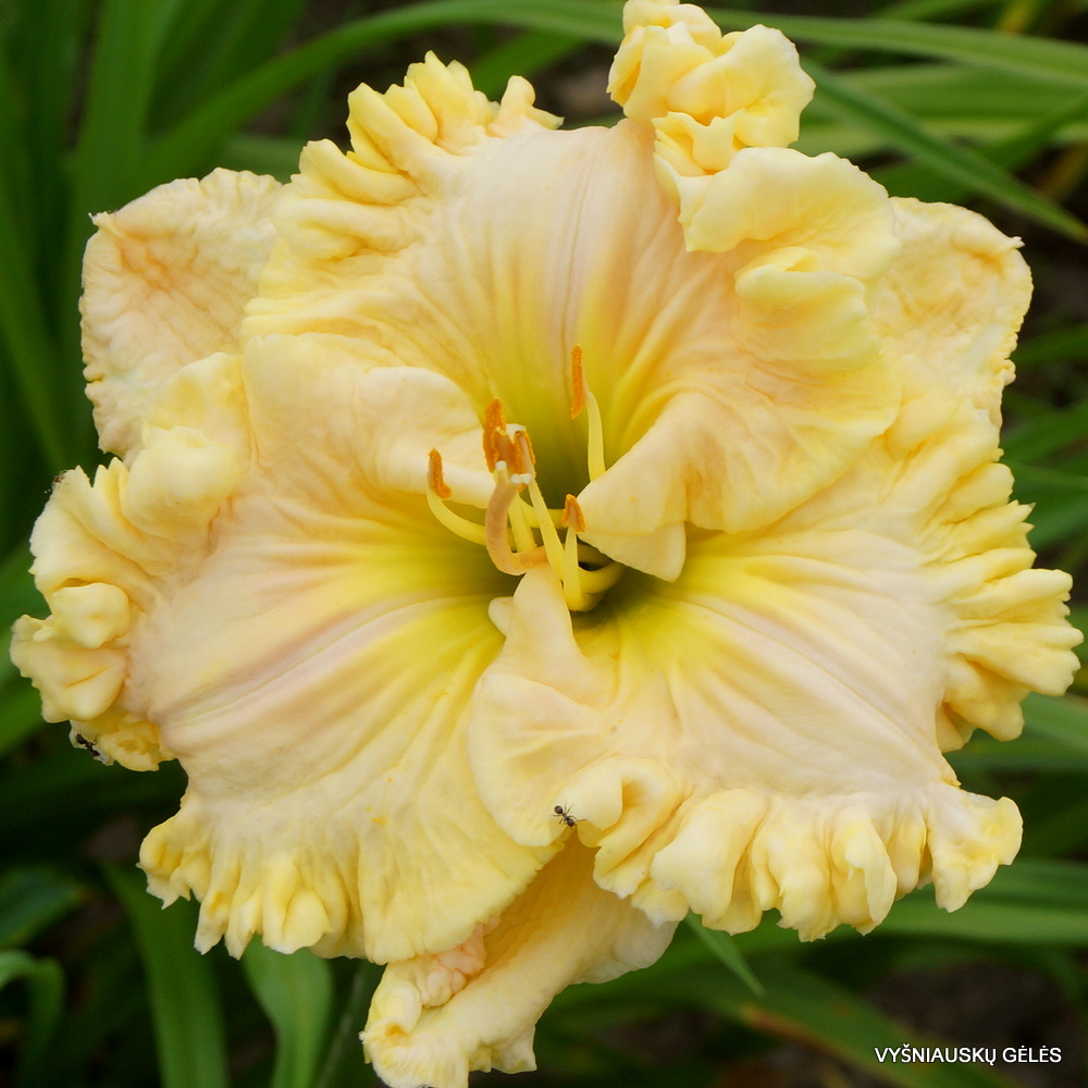 Žiedai vidutinio dydžio, šviesiai kreminiai su labai garbanotu, geltonu apvadu. A – 70 cm