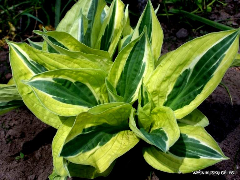 lapai pailgi, žali su siauru baltu apvadu ir plačiu geltonu pakraščiu. Vidutinė. A – 25-30 cm