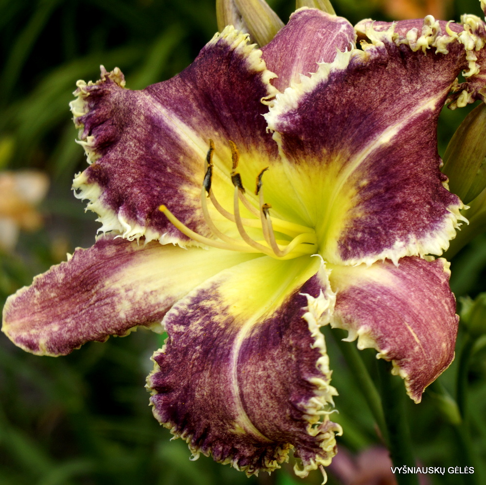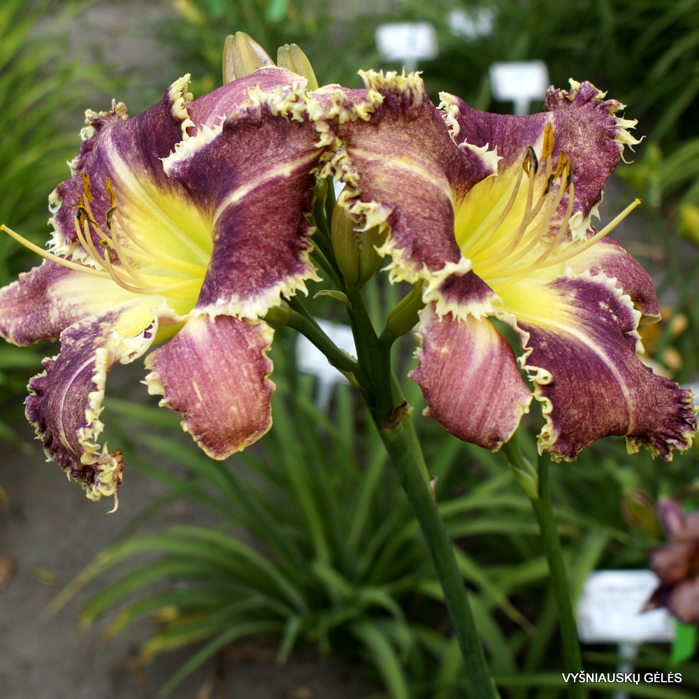 Žiedai vidutinio dydžio (15 cm skersmens) raudonai purpuriniai su šviesiais taškeliais. A – 90 cm